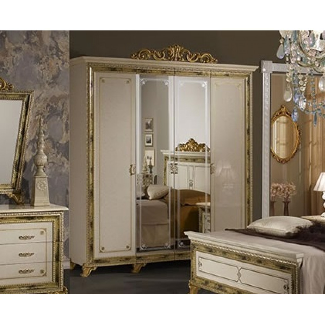 Четырехстворчатый шкаф для одежды Катя (беж) от Российской фабрики «ДИА мебель» выполнен в бежевом цвете с глянцевым покрытием и позолоченными, резными вставками на фасадах. Шкаф поделен на три части и имеет не только полки для одежды но и большую штангу для вешалок. Такой большой и многофункциональный шкаф будет незаменимым модулем в вашей спальне.