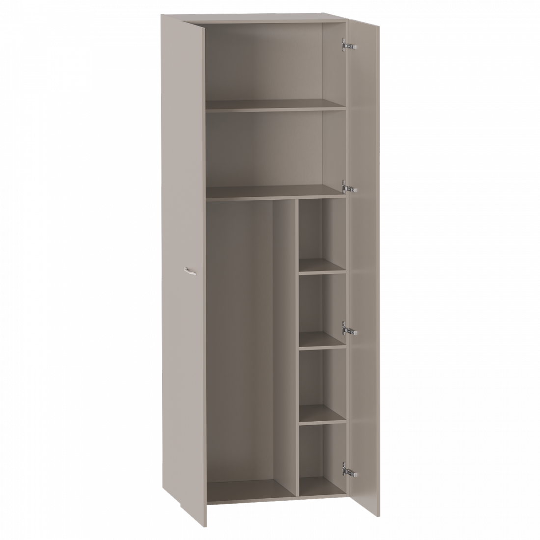 Шкаф двухдверный выполнен из ЛДСП цвета Капучино и имеет 2 вместительных полки в верхней части шкафа, 4 полки в правой части, и штангу для одежды на плечиках - в левой. Ручки в форме скобы выполнены из белого матового металла. Все петли - плавного закрывания