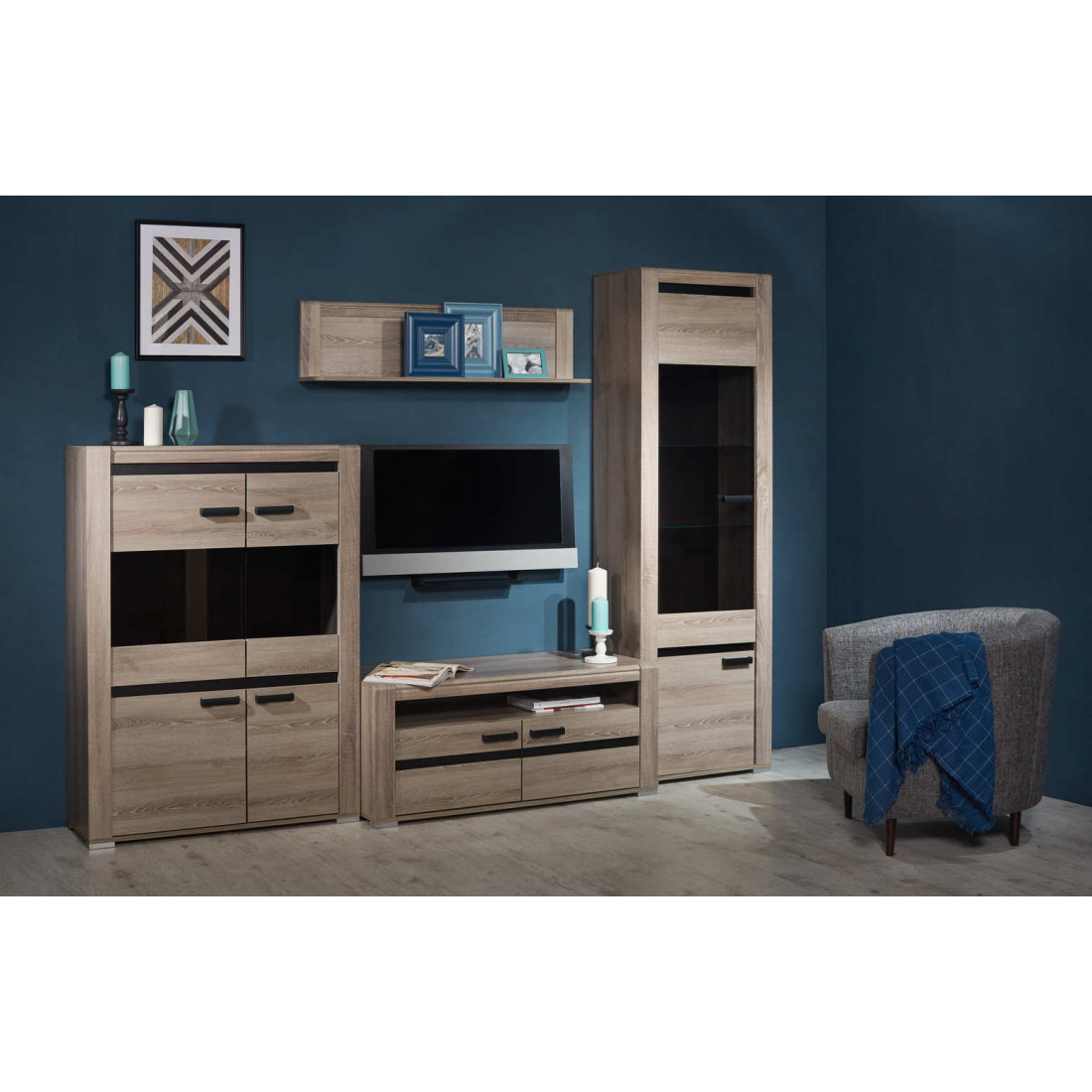 Гостиная «Бруна» - это продуманное и функциональное решение для тех, кто ценит грамотное оформление пространства. Эта гостиная в современном стиле превосходно сочетает в себе навесные открытые книжные полки, а также удобные модульные шкафы, которые создают весьма колоритный декор.