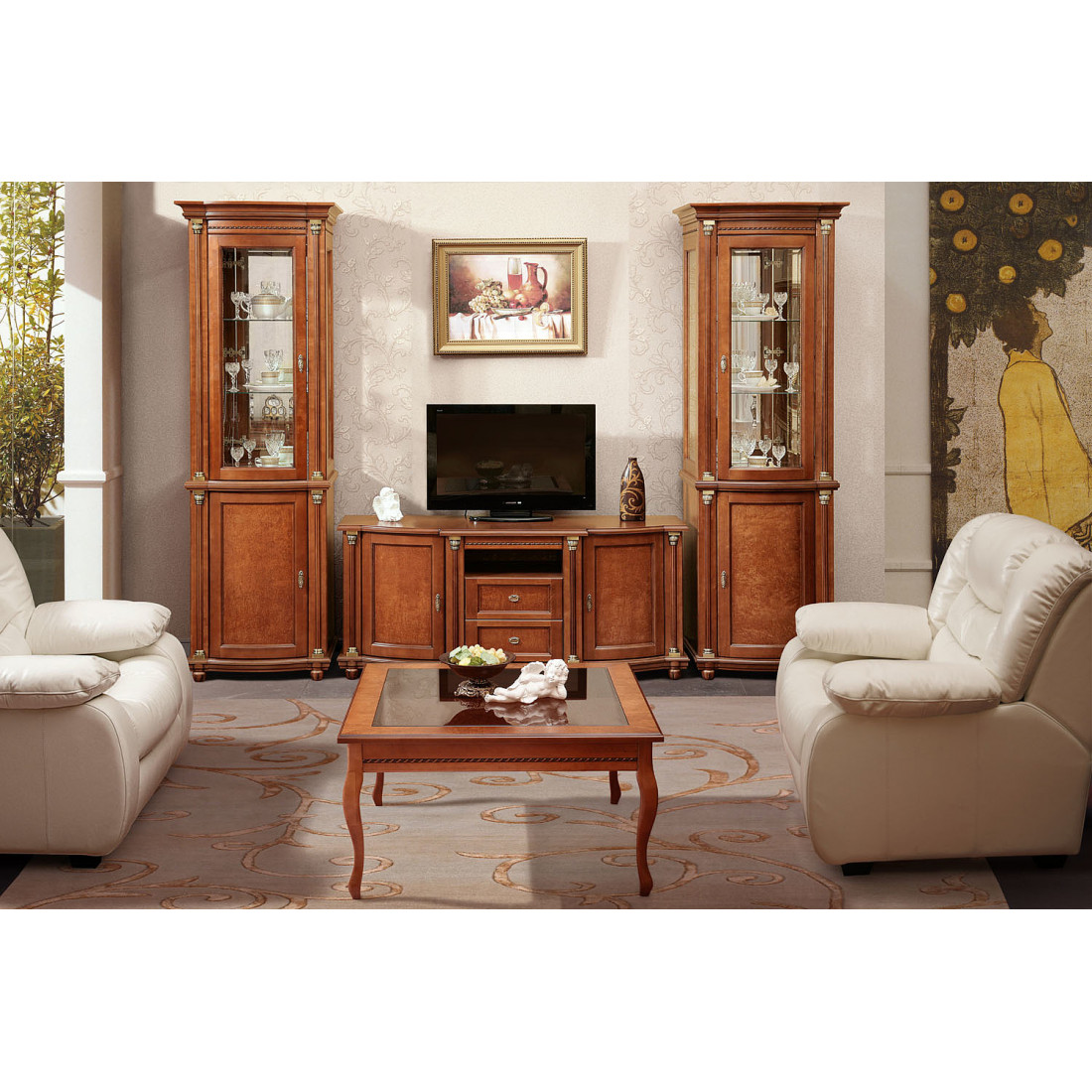 Программа Валенсия - испанская изысканность, стиль, качество, элегантность из массива березы. На фасадах используется шпон карельской березы, которая ценится во всем мире за свой неповторимый рисунок. Декоративная отделка резных элементов и мягкая подсветка в витринах добавляет шарма Валенси