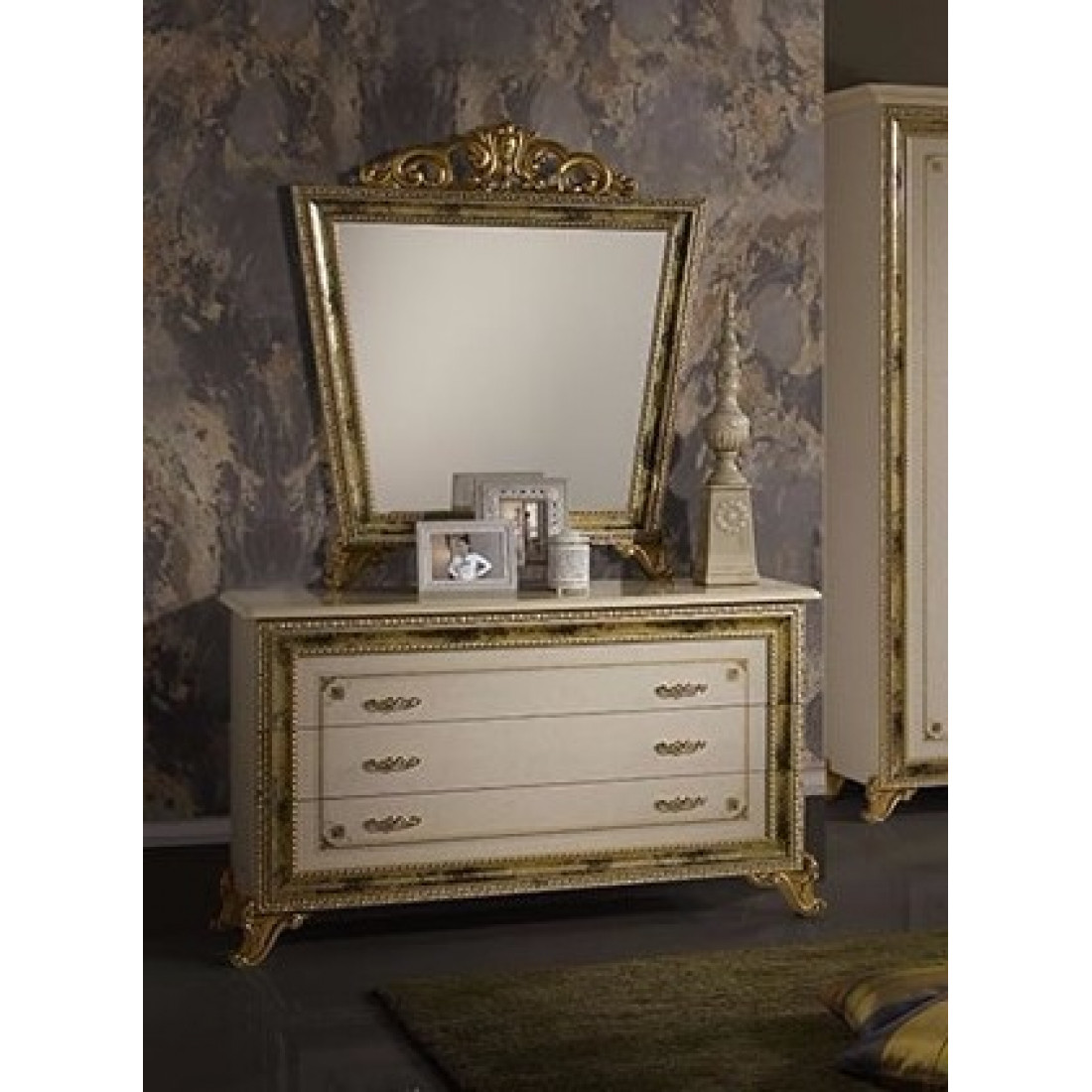 Комод для белья Катя с зеркалом (беж) от Российской фабрики «ДИА мебель» выполнен в бежевом цвете с глянцевым покрытием. Большое просторное зеркало увенчанное золотой короной, поможет вам придать атмосферу роскоши. Такой комод имеет три выдвижные полки. Он будет незаменим в вашей спальне.