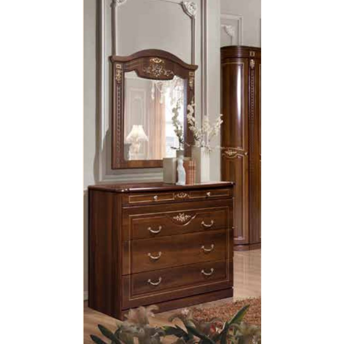 Комод для белья с зеркалом Сорренто (орех) – это универсальный модуль в вашей спальне. Три большие выдвигающиеся полки помогут Вам сложить все необходимые вещи, а четвертая узенькая полка подойдет для хранения косметики или аксессуаров. Его навесное зеркало сделает комнату светлее и просторнее. Классический стиль в сочетании с резными вставками и золотым орнаментом придает элегантность и неповторимые ощущения. Дворцовый стиль такого комода с зеркалом послужит показателем богатства и престижа хозяев дома.