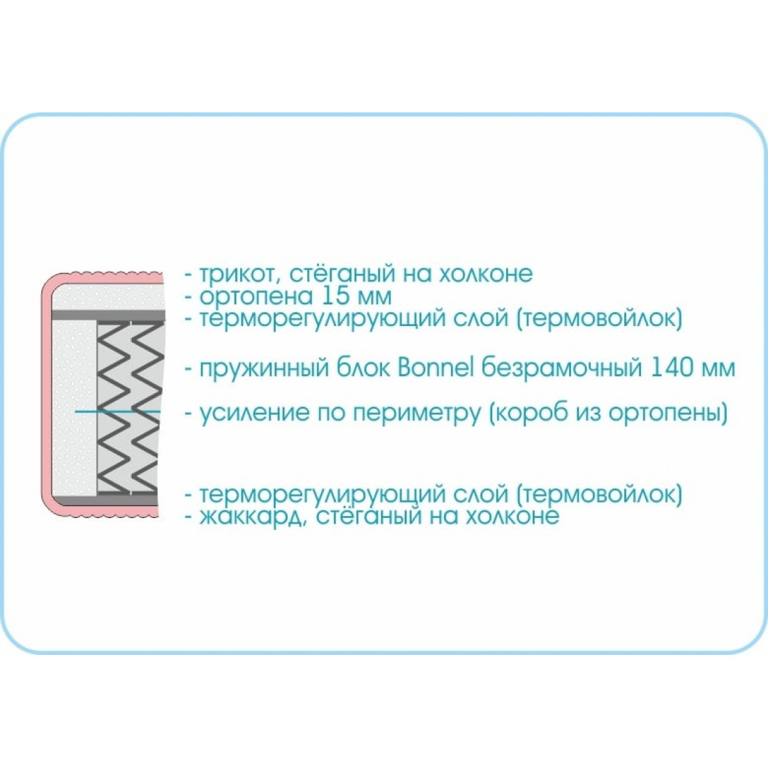 Наполнение: пружинный блок Bonnel безрамочный, высота блока 140 мм, ортопена 15 мм с одной стороны, терморегулирующий слой с двух сторон, усиление по периметру - короб из ортопены.