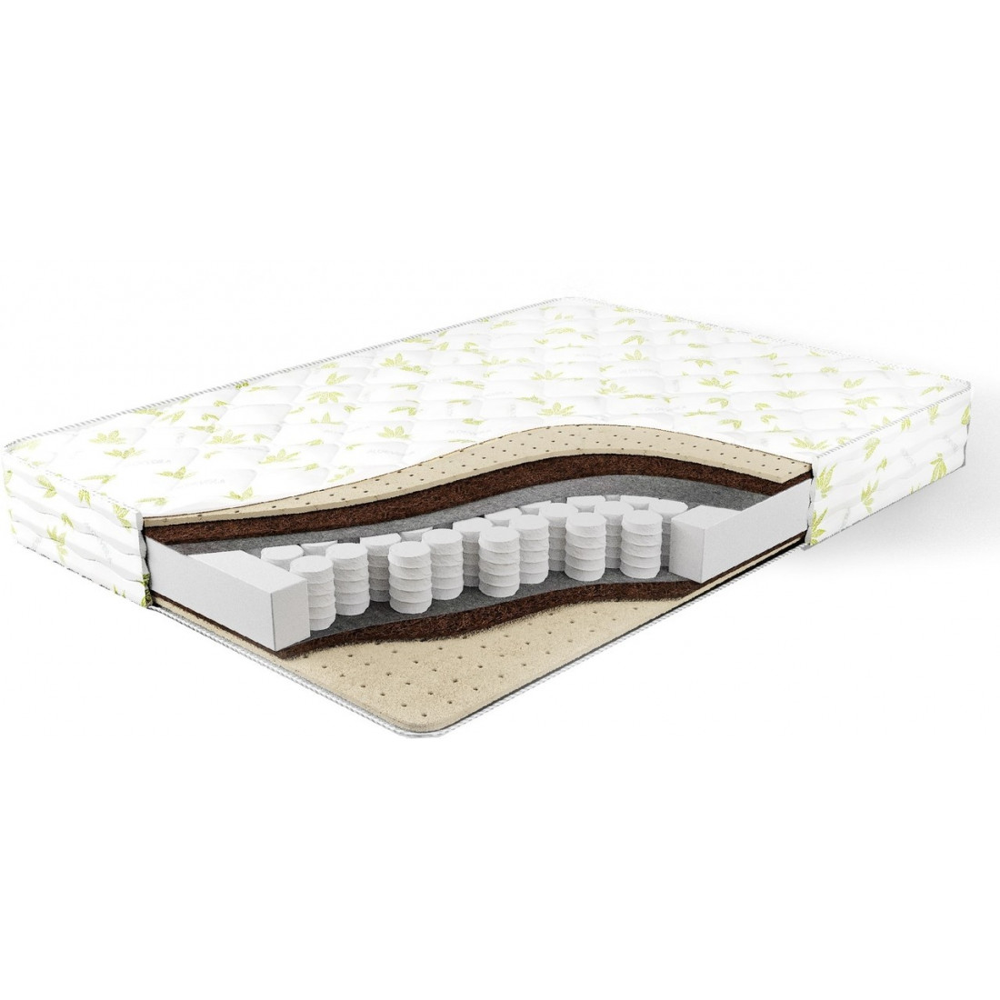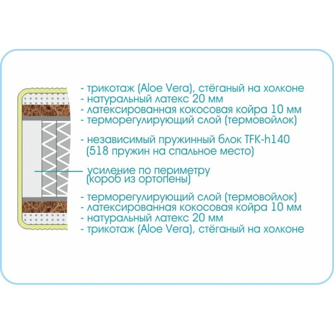Наполнение: независимый блок TFK, высота блока 140 мм, латекс 20 мм с двух сторон, кокосовая плита 10 мм с двух сторон, терморегулирующий слой с 2-х сторон, усиление по периметру - короб из ортопены.