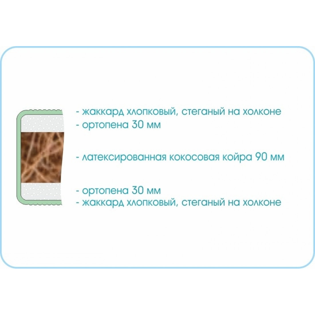 Наполнение: ортопена 30 мм с двух сторон, основа - кокосовая плита 90 мм.