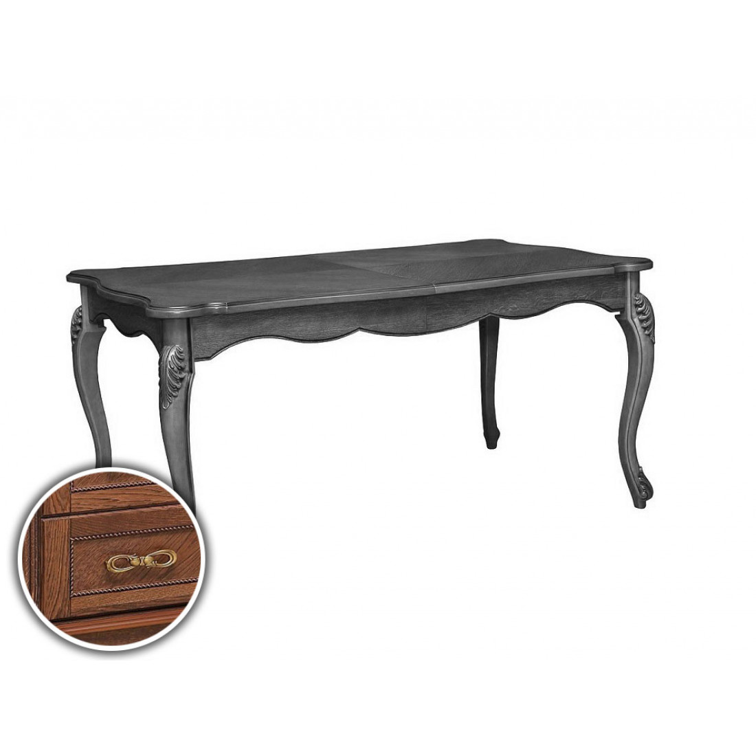 Стол Алези 14Р П 353.09 с крышкой, имеющей декоративное профильное фрезерование кромок, из плиты древесноволокнистой средней плотности (плита МДФ), облицованной шпоном древесины по технологии "интарсия (инкрустация)", установленной на четыре точеные ножки из пиломатериалов лиственных или хвойных пород. Продольные и поперечные царги с фигурной нижней стороной и имеющими декоративное профильное фрезерование кромок и лицевой пласти, из пиломатериалов лиственных или хвойных пород. Продольные царги имеют декоративные накладные элементы.