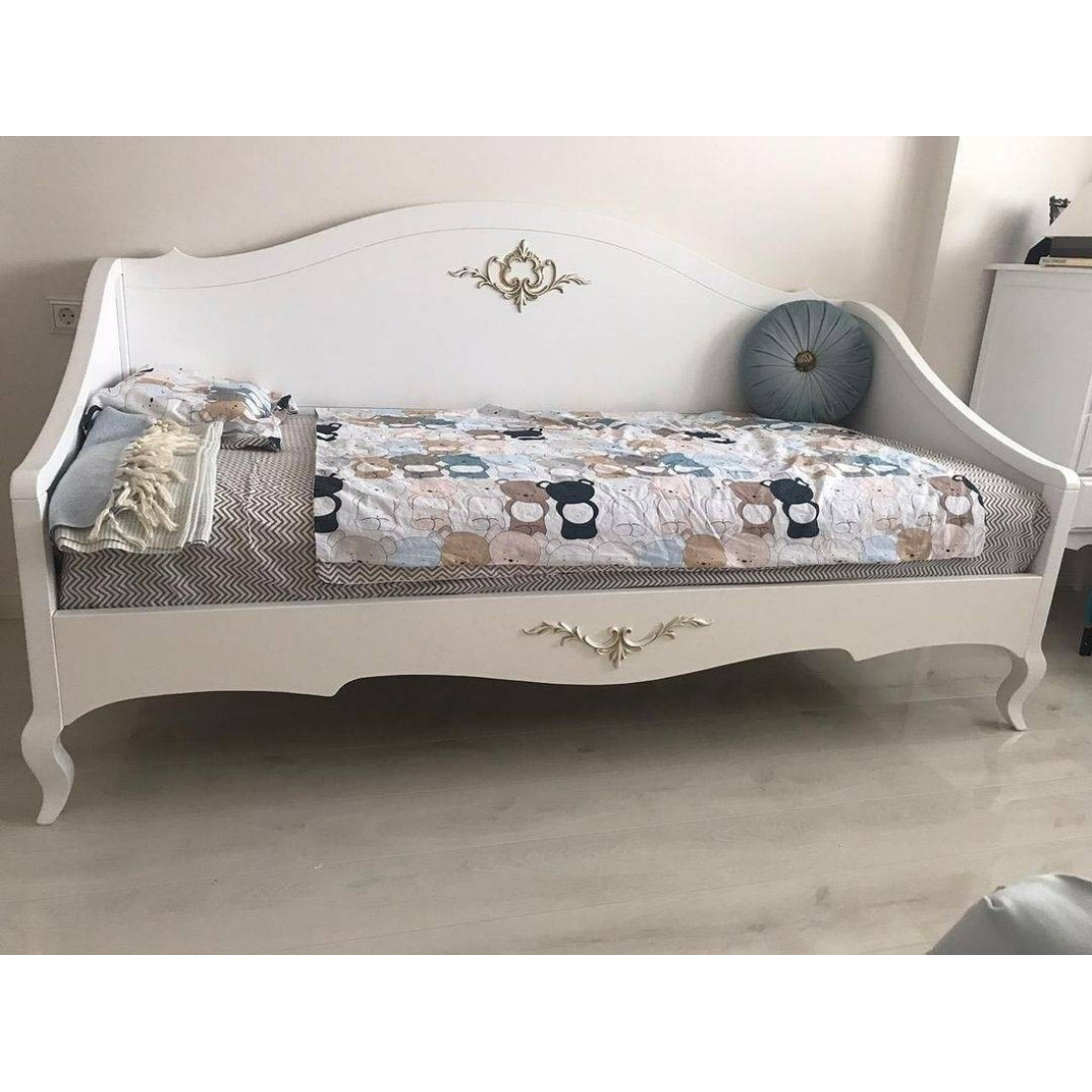 Кровать оснащена ортопедическим основанием для матраса — ламелями.