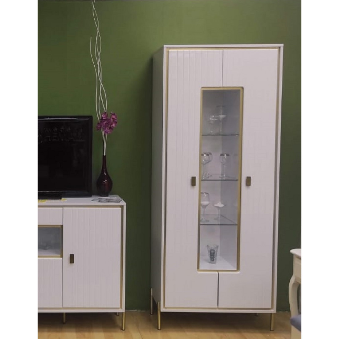 Купить витрину в гостиную можно отдельно, так и дополнив ее тумбой или полкой из серии.