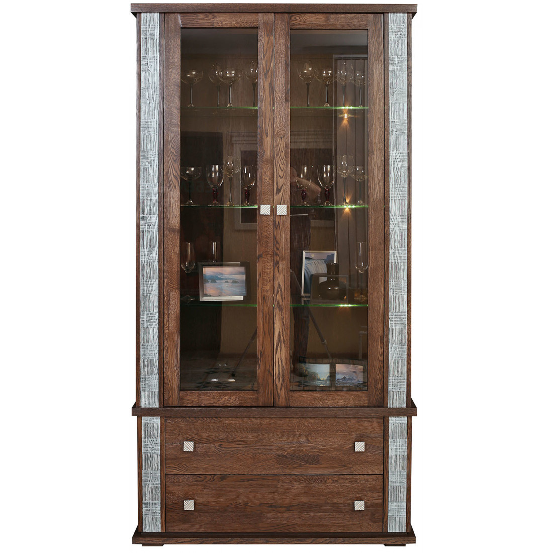 Двухдверная витрина из коллекции белорусского производителя Пинскдрев. Благородная деревянная текстура, подчеркивающие глубокий цвет венге серебряные элементы, геометричная фурнитура - выставленная в такой витрине посуда заиграет новыми красками.