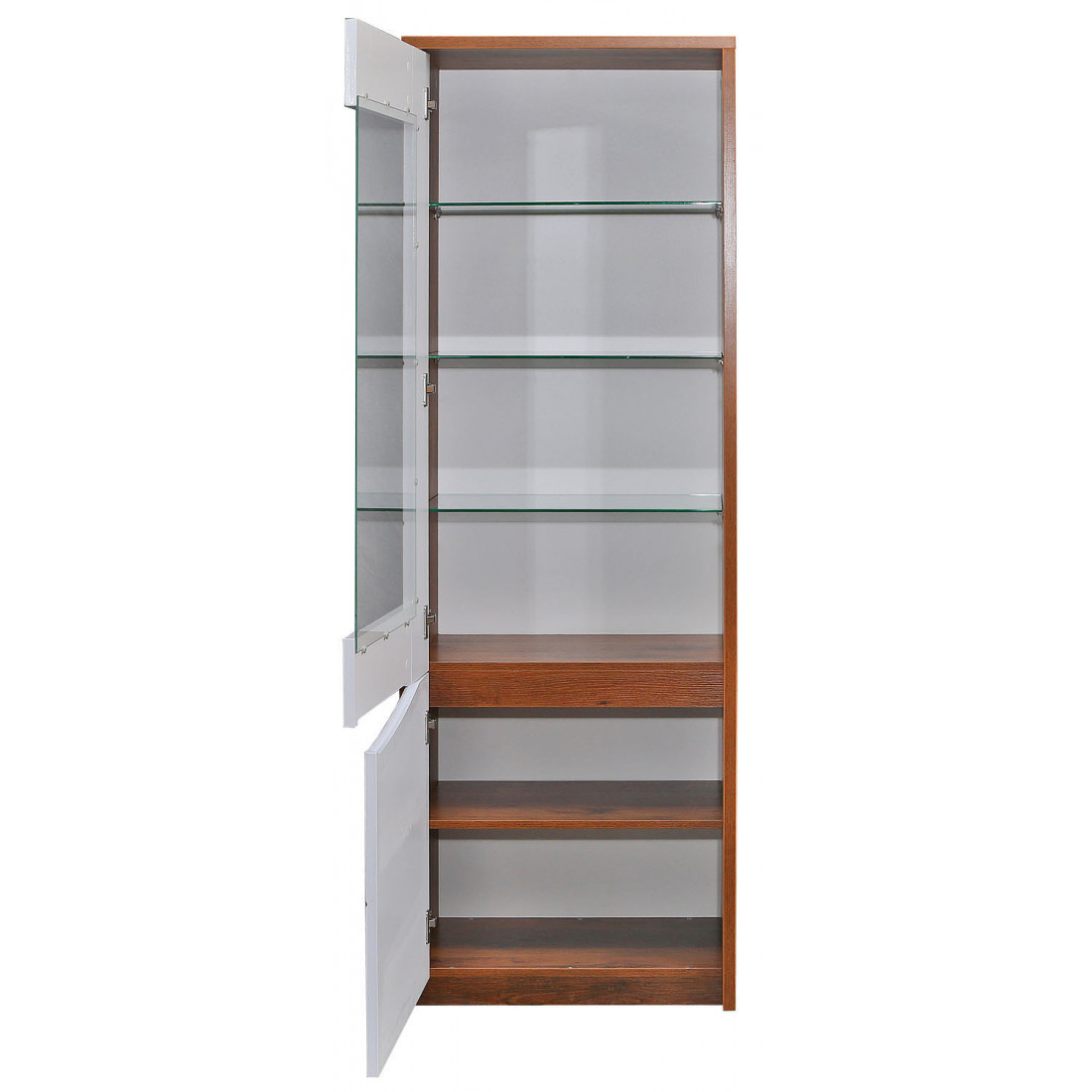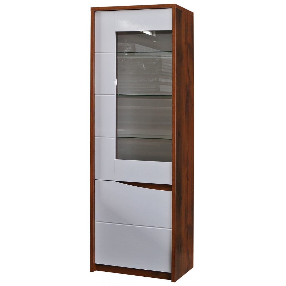 Шкаф-витрина Монако П 510.01 с левосторонними дверями имеет своеобразный дизайн: за стеклянной дверцей - полочки. На резных фасадах отсутствует лицевая фурнитура, что делает мебель стильной и нестандартной