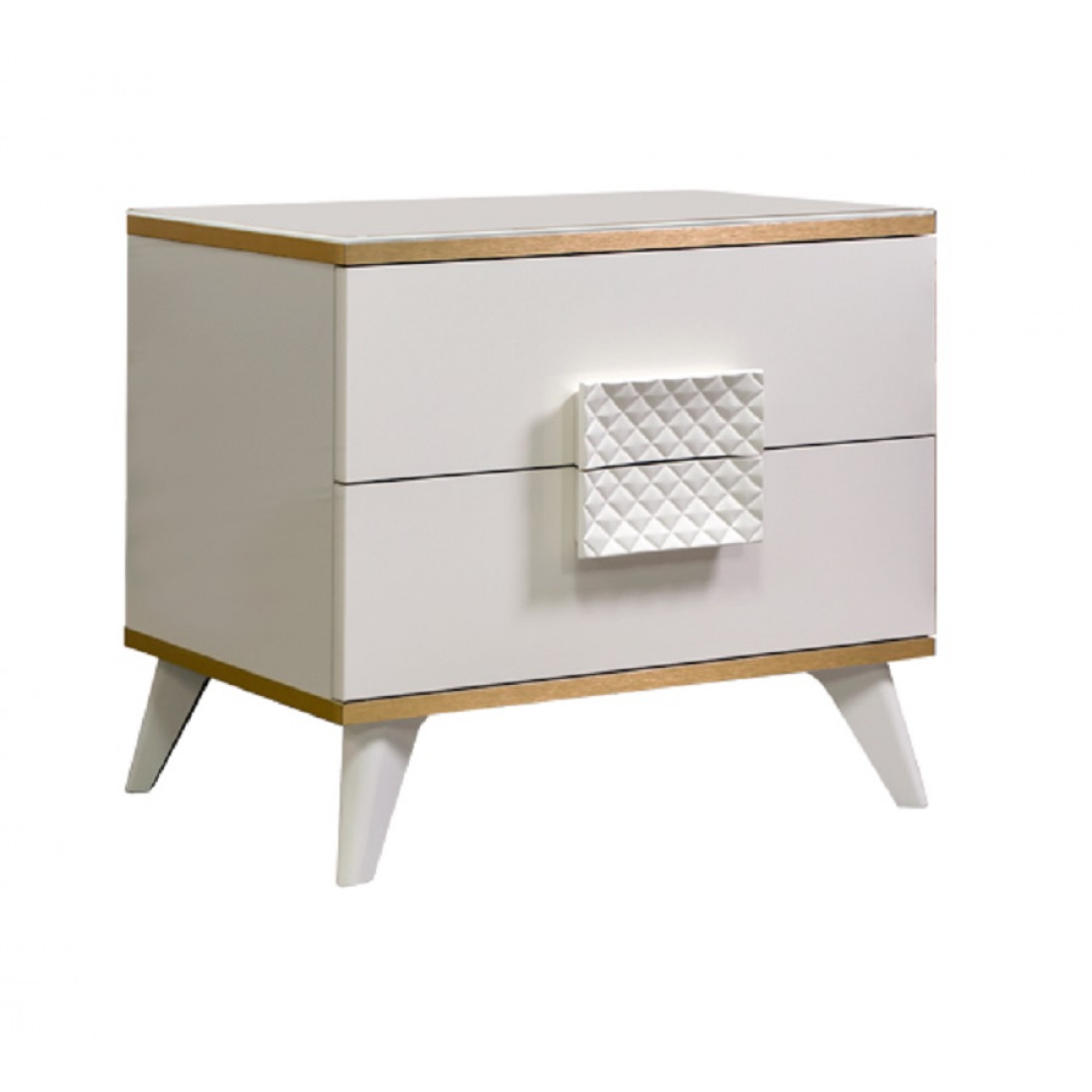 Великолепно вписались в концепцию спальни «Diora» поверхность комодов и тумбочек выполненная из стекла в соответствии с цветами корпуса. Это решение позволяет чаще делать влажную уборку и не боятся, что мебель испортится.