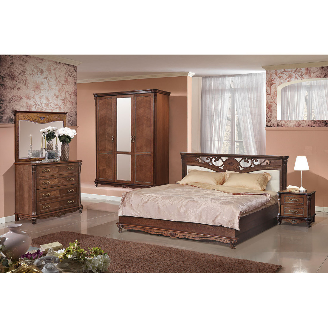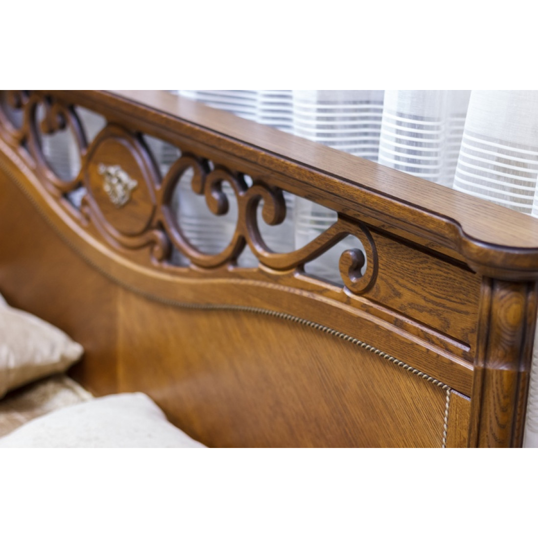 При создании спальни "Алези" предпочтение было отдано самому прочному материалу - массиву дуба, представленному в двух цветовых вариантах: "античная бронза" и "слоновая кость с патиной". Особое внимание уделено декоративным узлам и элементам, придающим линиям плавность и изящество: пилястрам, опорам, карнизам. Резьба и позолота утонченно подчеркивают их красоту.