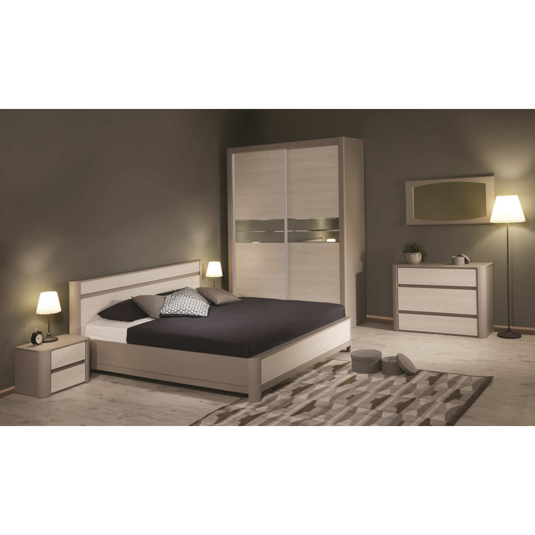 Гарнитур для спальни «Лацио» украсит пространство, сделает его легким и уютным. Спокойные тона и фактуры, задействованные в данной мебели, располагают у отдыху. Сочетание глубокого серого и светлого оттенков исключают громоздкость и помогают достичь эффекта зрительного увеличения пространства. Приобретение мебели «Лацио» гарантирует покупателю визуальную эстетику, а также удобство и практичность применения.