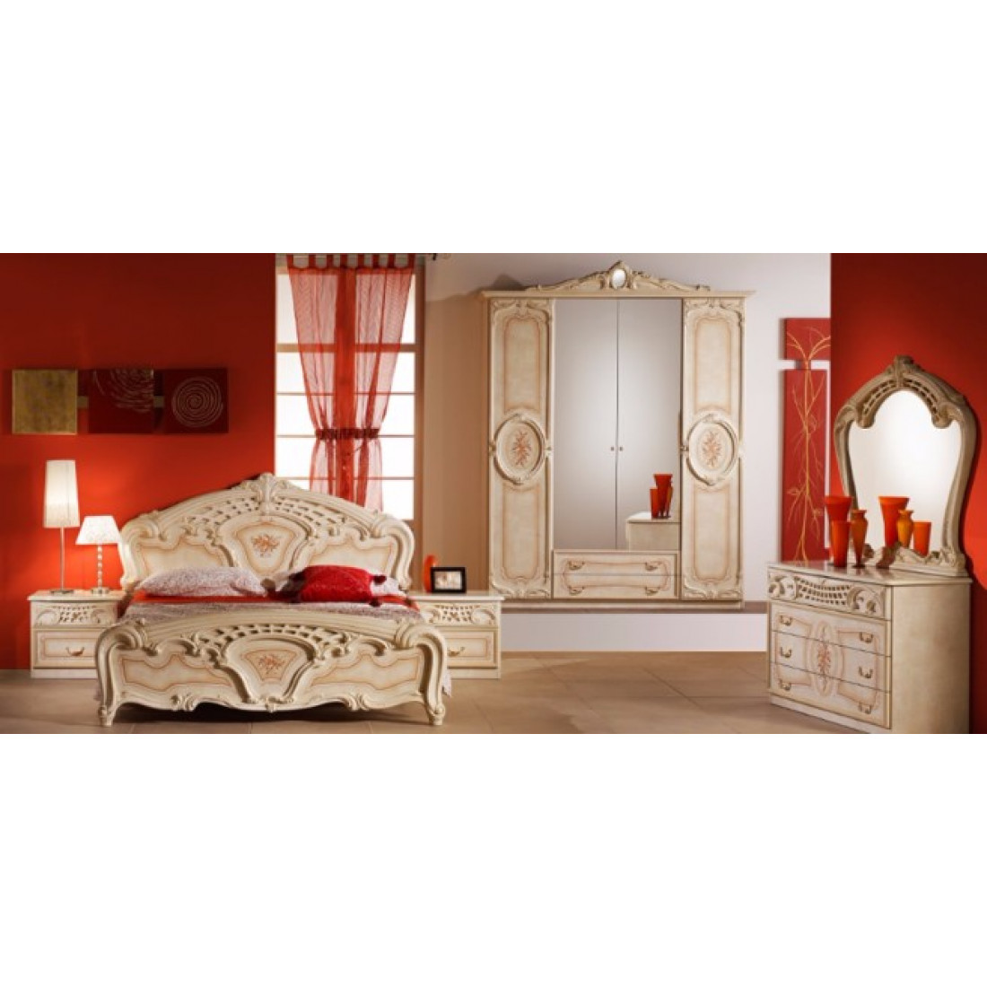 Спальня Роза (беж) от Российской фабрики "ДИА мебель". Выполнена в классическом стиле. Такая спальня коллекции Роза порадует Вас своим дизайном и многофункциональностью. Бежевый цвет в сочетании с глянцевым покрытием и орнаментом на фасадах, придает этой модели еще изысканности и подчеркивает прекрасное чувство стиля своего владельца. Поможет насладиться прекрасным вечером после трудного дня.