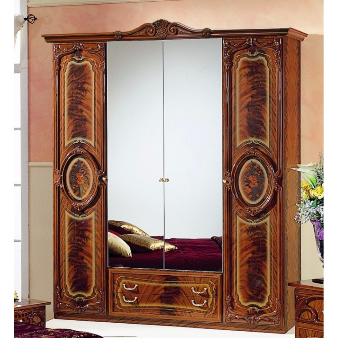 Спальня Роза (орех) от Российской фабрики "ДИА мебель". Выполнена в классическом стиле. Такая спальня коллекции Роза порадует Вас своим дизайном и многофункциональностью. Ореховый цвет в сочетании с глянцевым покрытием и орнаментом на фасадах, придает этой модели еще изысканности и подчеркивает прекрасное чувство стиля своего владельца. Поможет насладиться прекрасным вечером после трудного дня.
