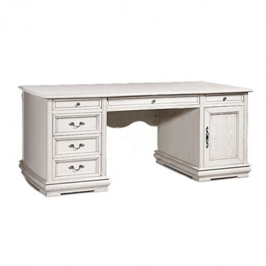 Настоящей изюминкой домашнего кабинета может стать письменный стол из коллекции "Оскар". Натуральная фактура дуба, тонкие оттенки цветовой гаммы и фурнитура из золота и черненного серебра придают столу поистине аристократичный вид. На представительной дубовой столешнице гармонично смотрятся и современные гаджеты и раритетные письменные принадлежности. Дно ящиков обращает на себя внимание великолепной велюровой отделкой. Стол выполнен в цвете "белая эмаль с патиной".