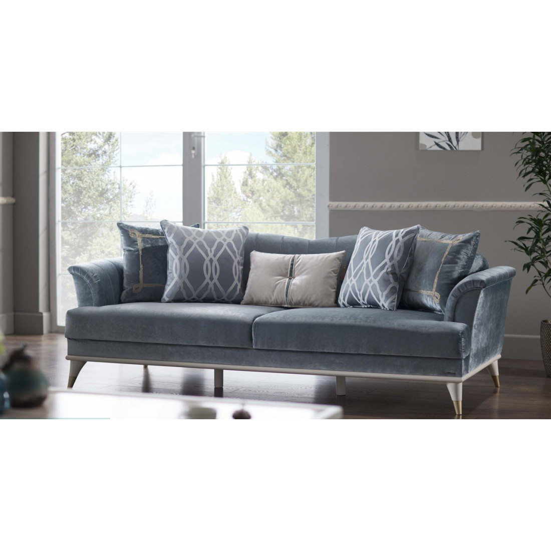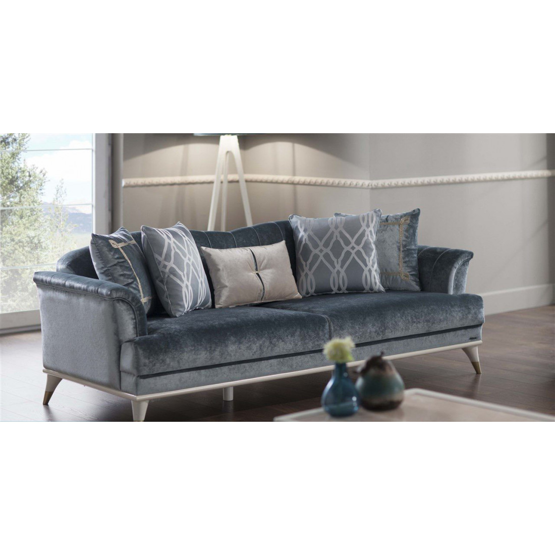 Трехместный диван "Monreal" выполнен в современном стиле, а его цветовые решения подойдут как для светлого интерьера, так и для темного. Современные вертикальные линии расположились на внутренних сторонах подлокотников и спинки. В комплекте идут пять великолепных подушек в разных исполнениях. Изделие покрыто невероятно мягкой и легко очищающийся тканью, а высокие ножки помогут упростить уборку в доме. Диван при необходимости без труда может превратиться в комфортную и просторную кровать.