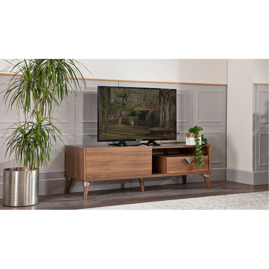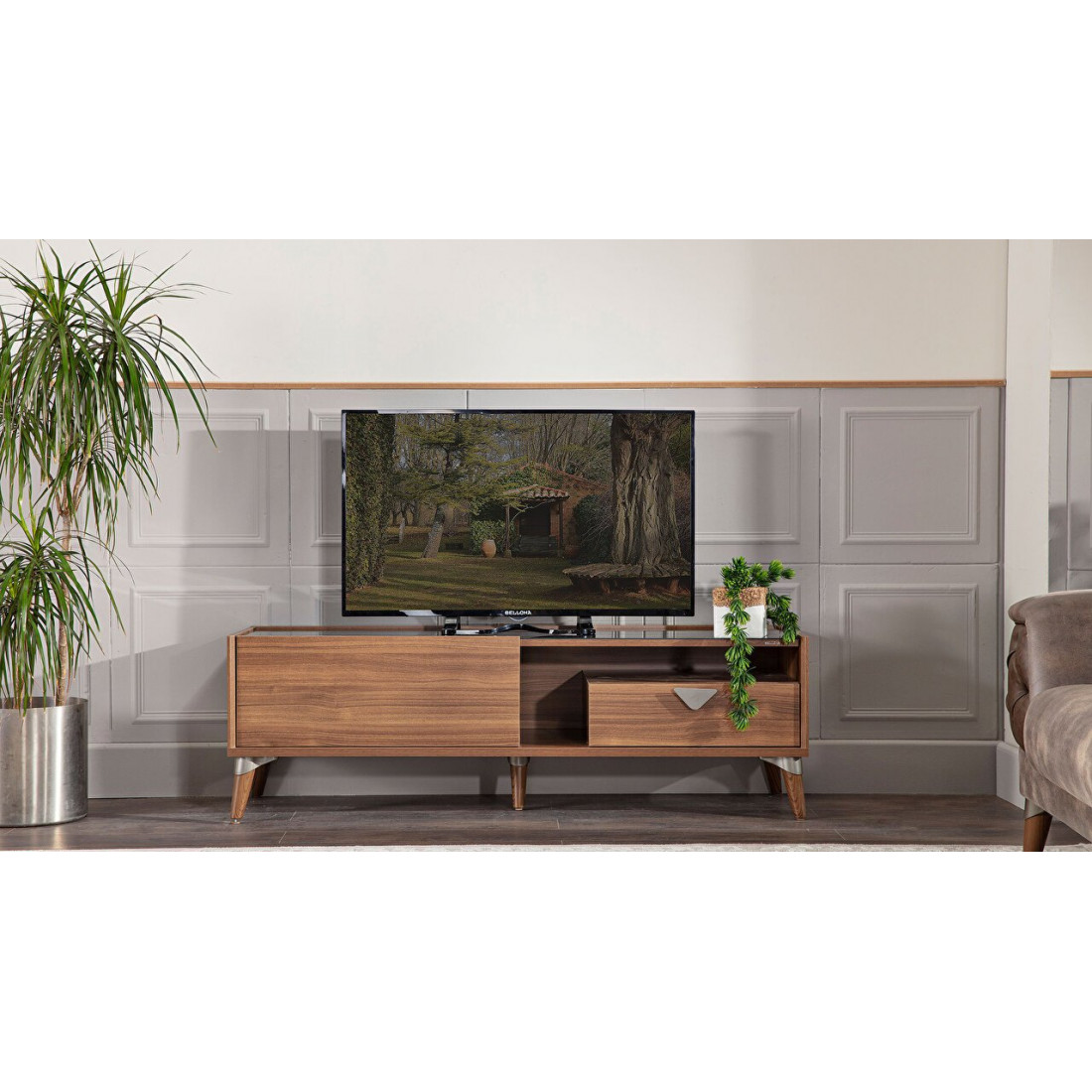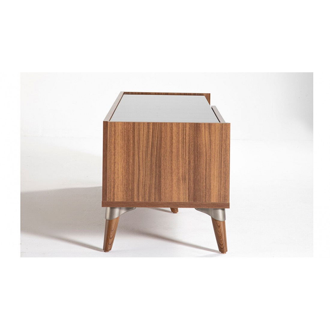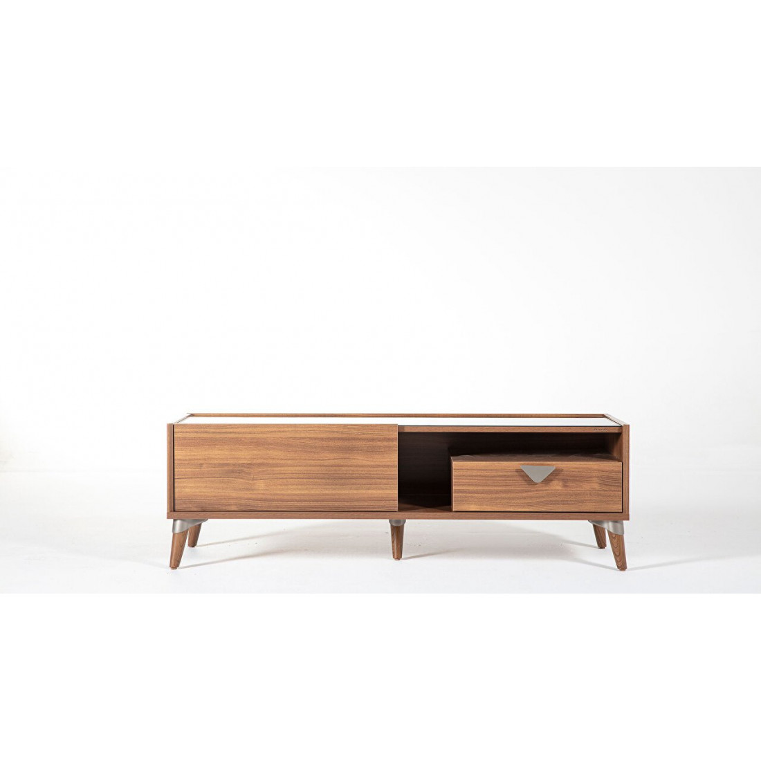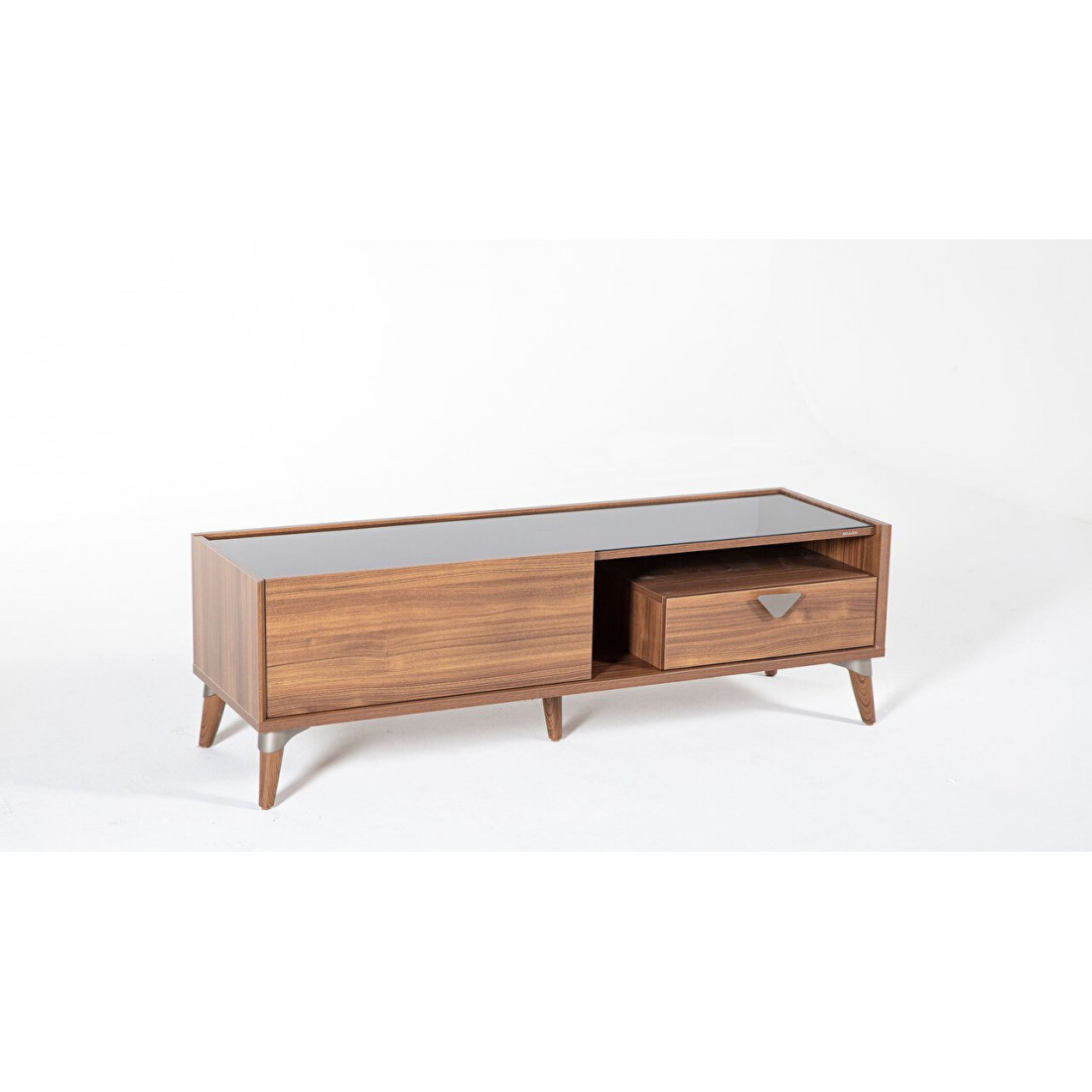 Изделия представлены в цвете грецкого ореха. Ручки изделий в наборе представлены металлические. Высокие ножки позволяют легко убираться в доме. Тумба под ТВ предназначена для телевизора размером до 47 дюймов. Ее столешница сделана из черного стекла.