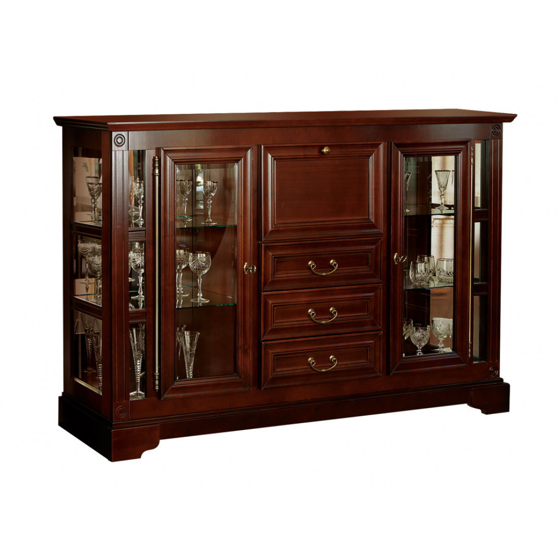 Двухдверная тумба со стеклянными витринами и выдвижными ящиками из набора корпусной мебели "Полонез" прекрасно впишется в интерьер классической гостиной. Стеклянные витрины, закрывающиеся на ключ, будут прекрасно демонстрировать гостям ваш хрусталь или статуэтки, а в в ящики на направляющих с доводчиком фирмы "Hettich" можно убрать все то, что не предназначено для посторонних глаз. Тумба "Полонез" с классической резьбой выполнена из массива бука и букового шпона в сочном оттенке "Черешня".