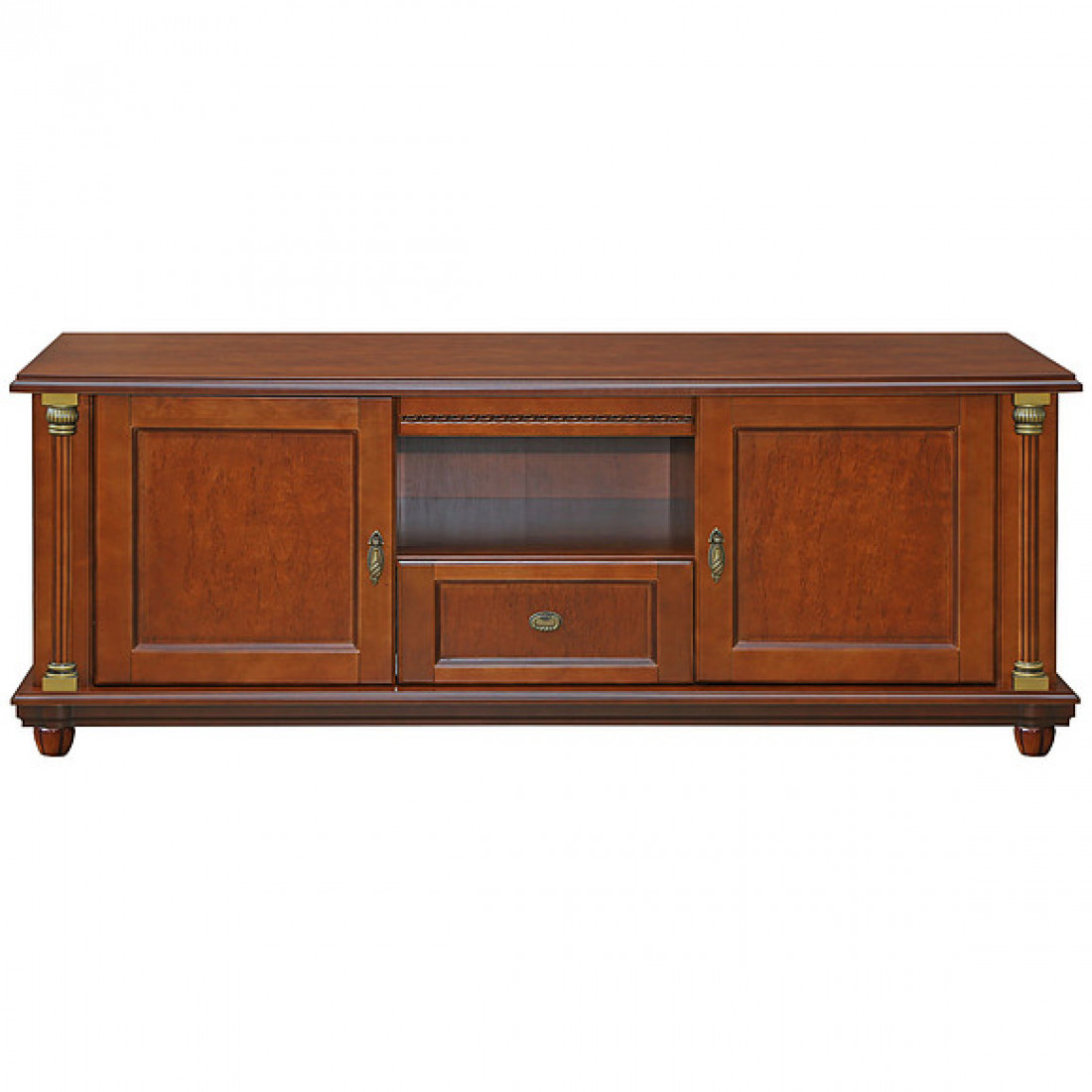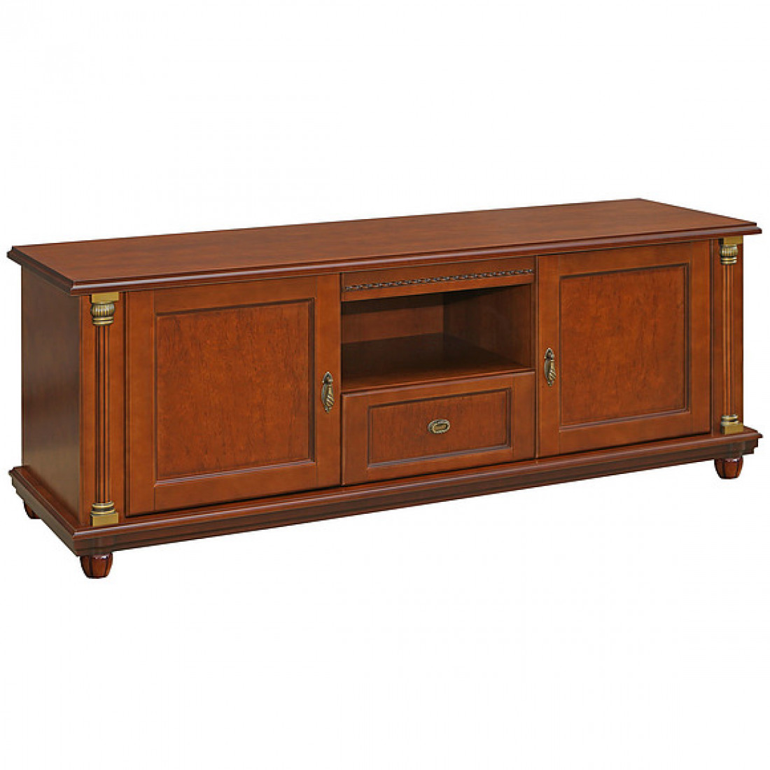 Тумба «Валенсия» П444.01 (каштан) из коллекции Валенсия от белорусского производителя с большим количеством ящиков позволит организовать хранение полезных мелочей и принадлежностей в вашей гостиной. Позволит разместить аудио-видеоаппаратуру с большим комфортом и дополнит ваш интерьер шармом карельской березы, которой отделаны поверхности изделия.